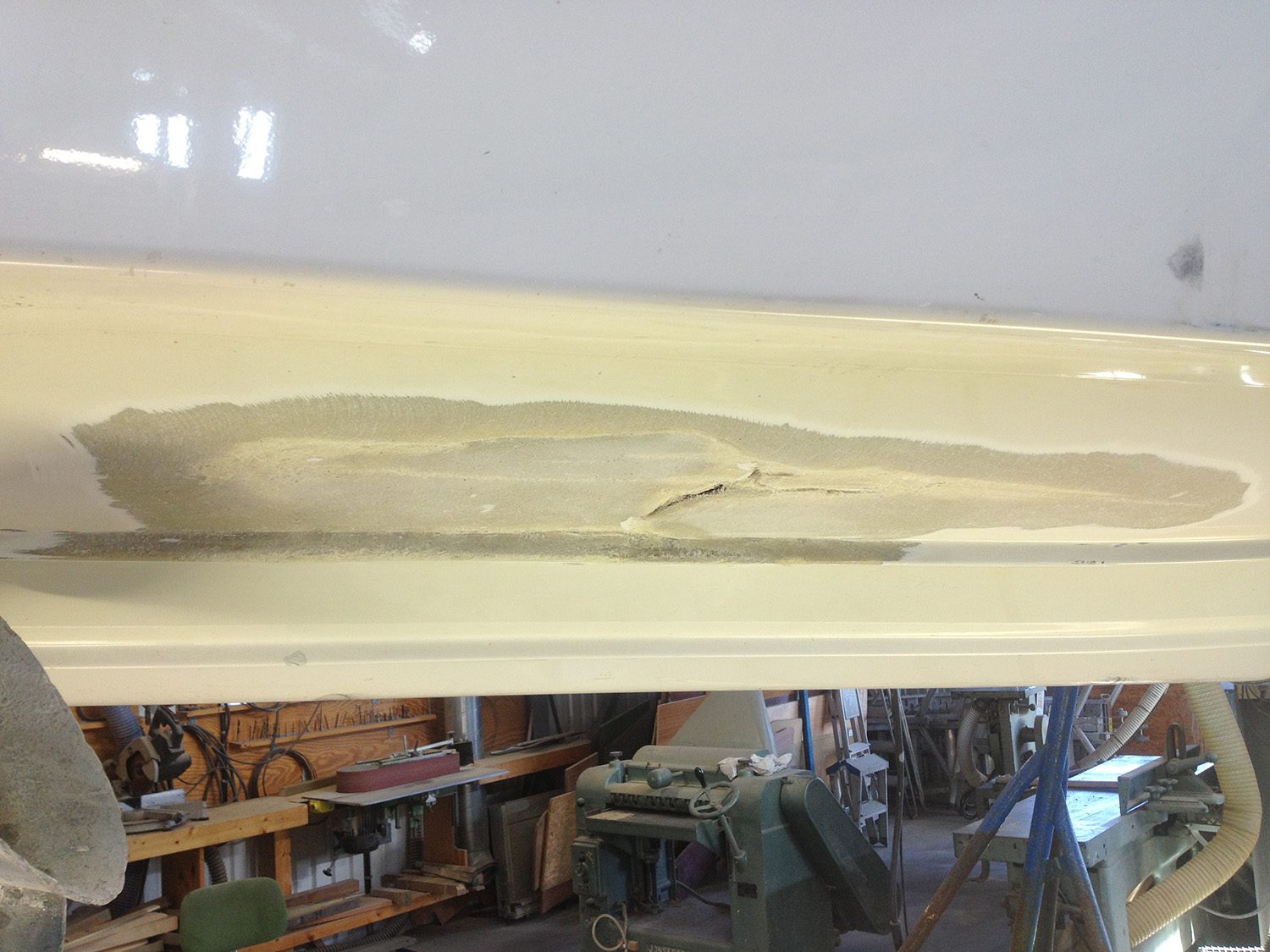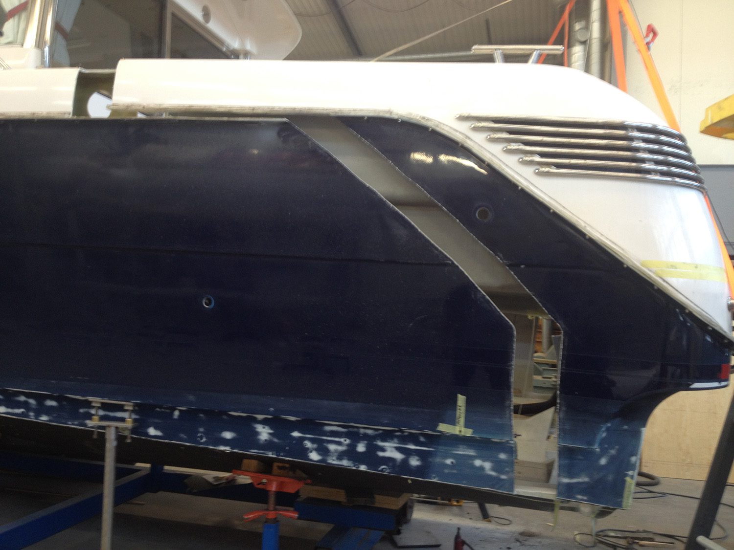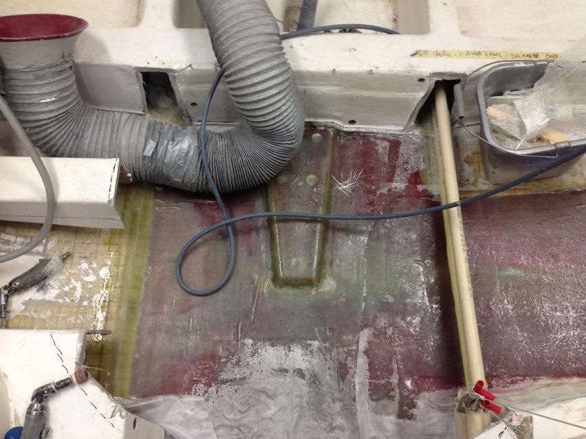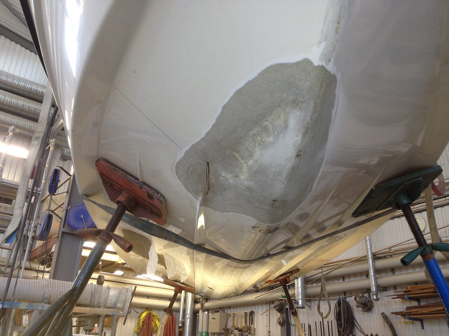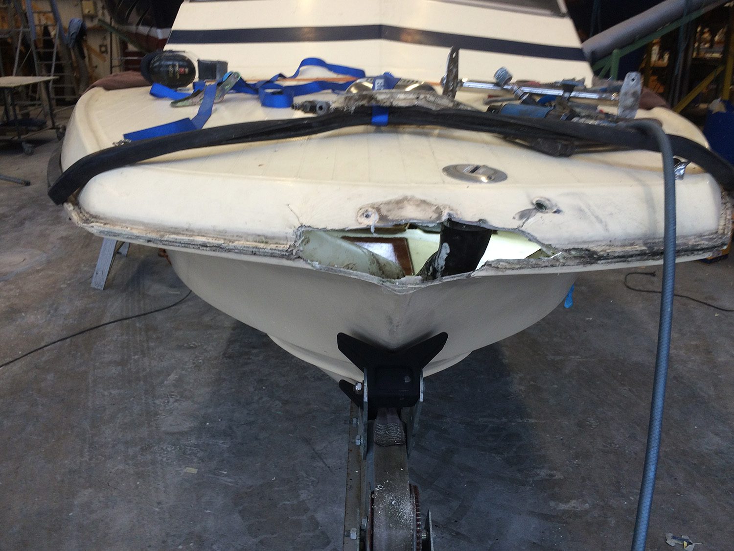 Reparation av grundstött motorbåt med brustet skrov.