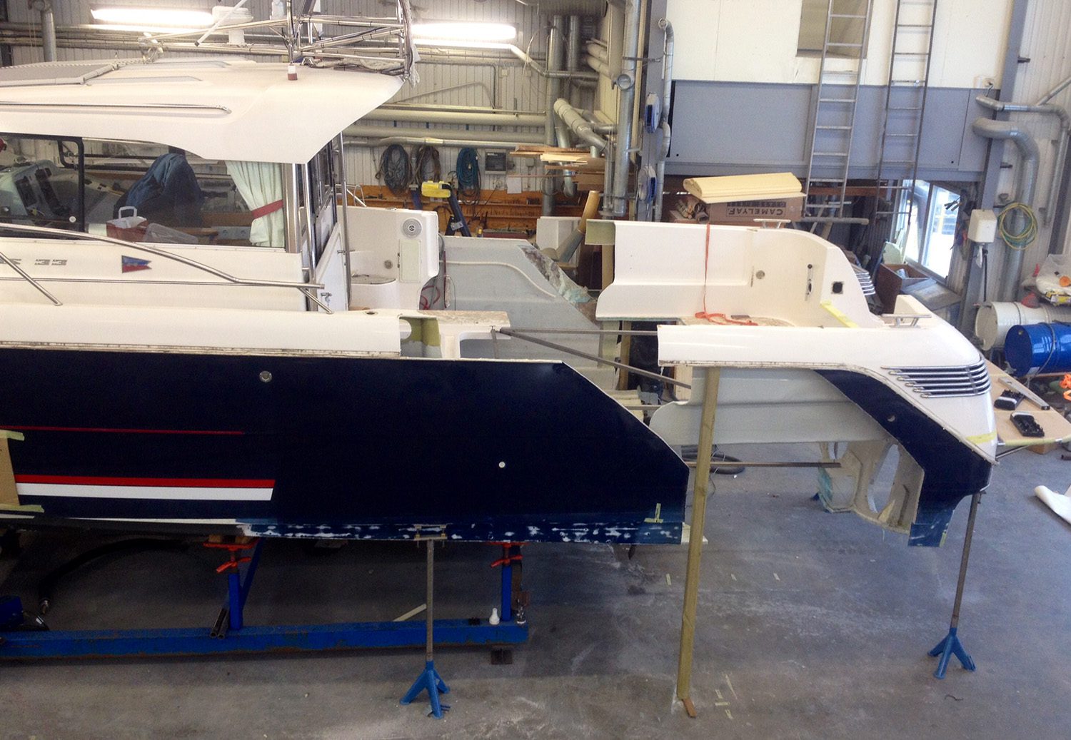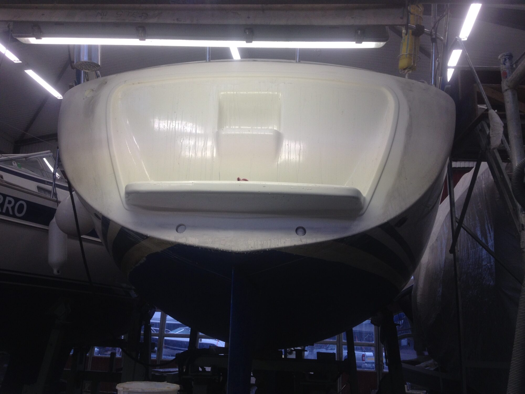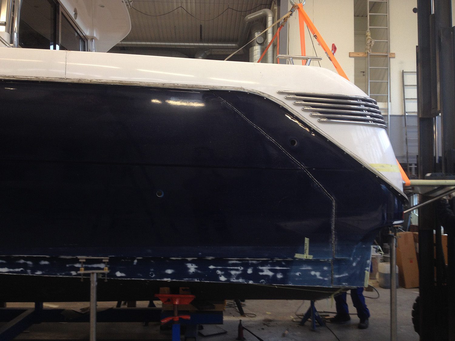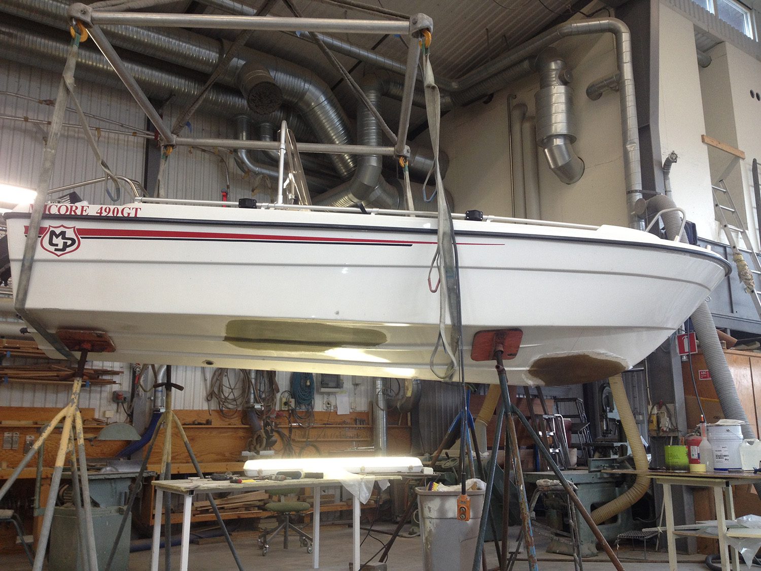 Reparation av grundstött motorbåt med brustet skrov.